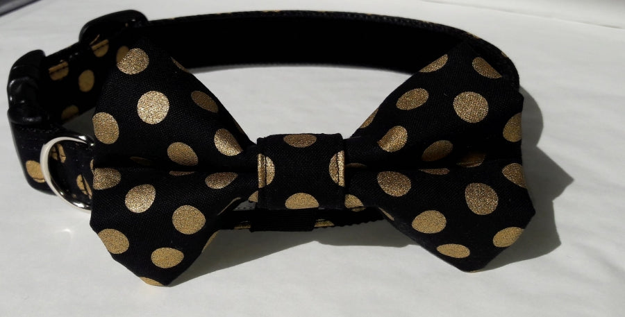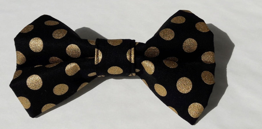 Dress up your dog for those special occasions in this stylish black and gold metallic spot bow tie.