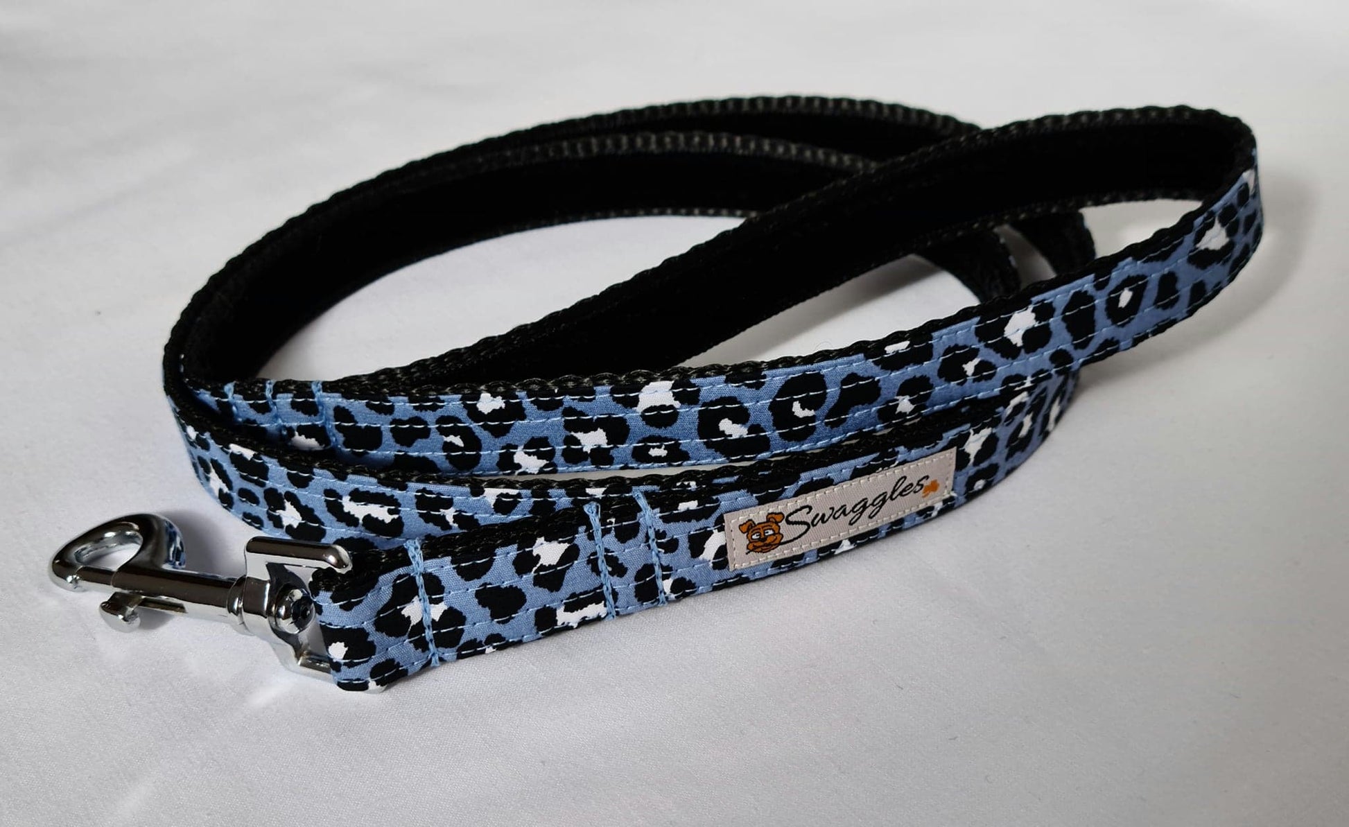 A blue/grey and white leopard print fabric, the lead is a combination of fabric on one side and black velvet ribbon on the other, handle is lined with velvet for comfort.