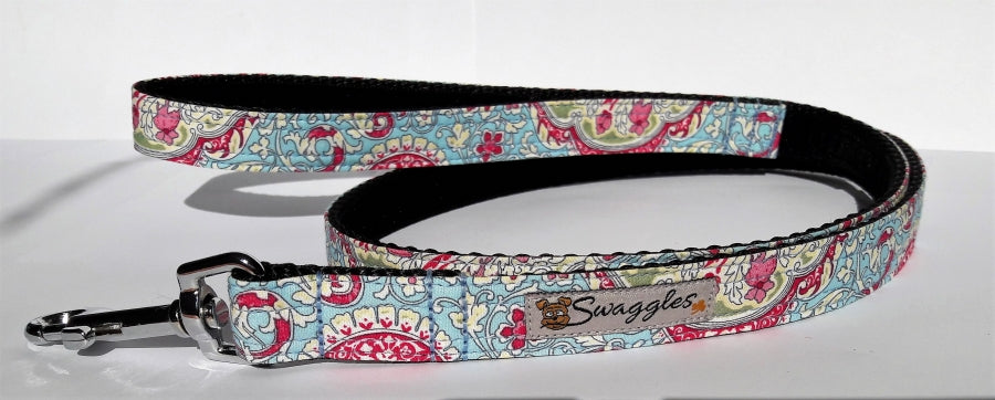 A blue and red paisley lead, lead is a combination of fabric on one side and black velvet ribbon on the other, handle is lined with velvet for comfort.