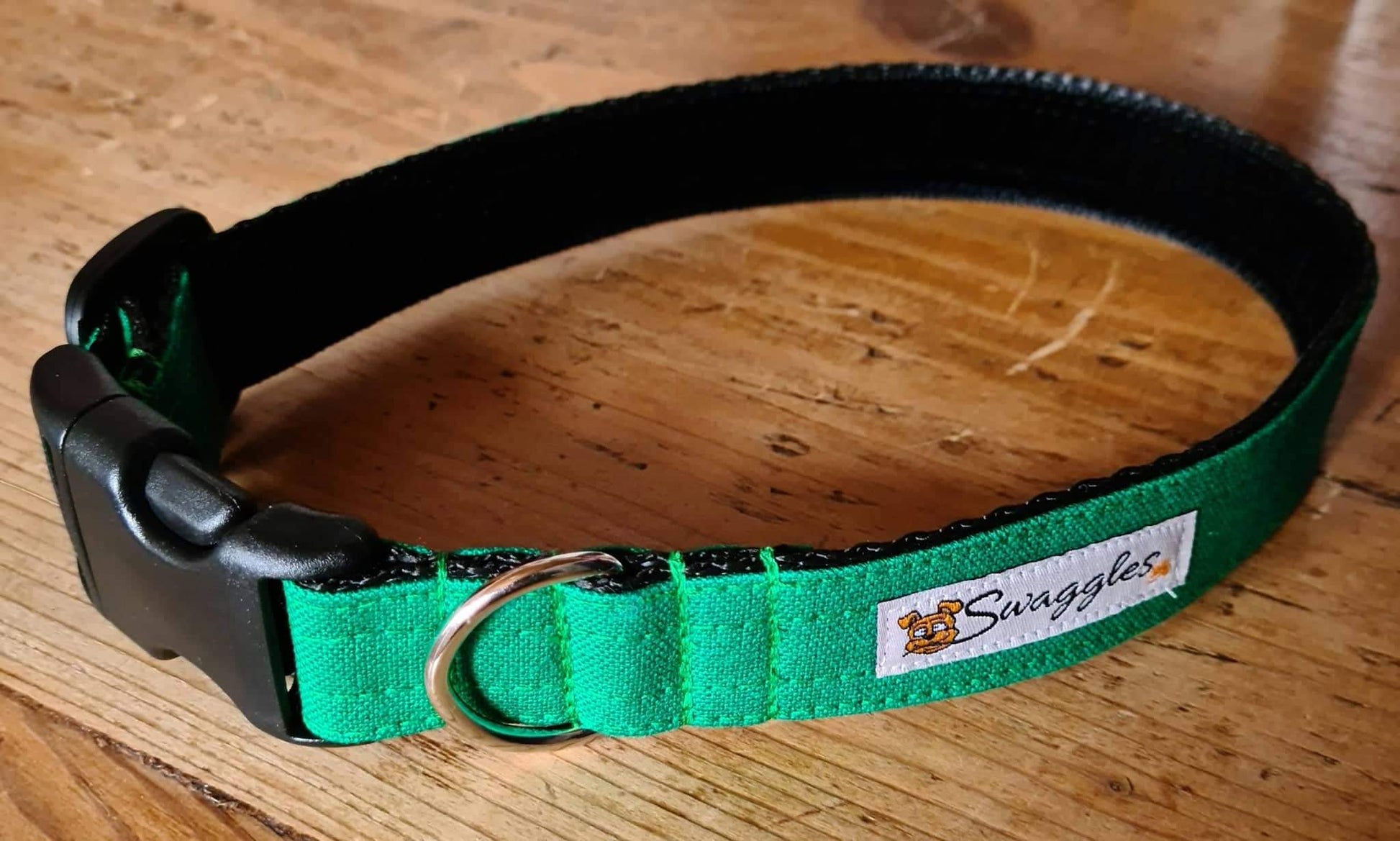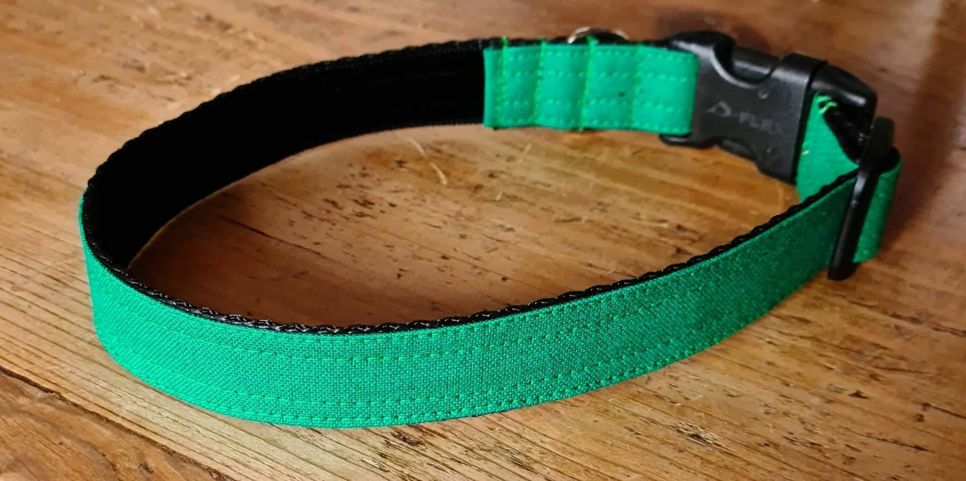 A strong emerald green canvas collar, lined with black velvet ribbon.