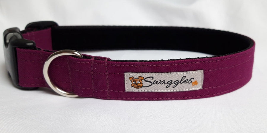 A hard wearing canvas in a gorgeous mulberry colour, ideal for adding embroidery and a metal buckle for that extra bit of sparkle! The collar is lined with black velvet ribbon.