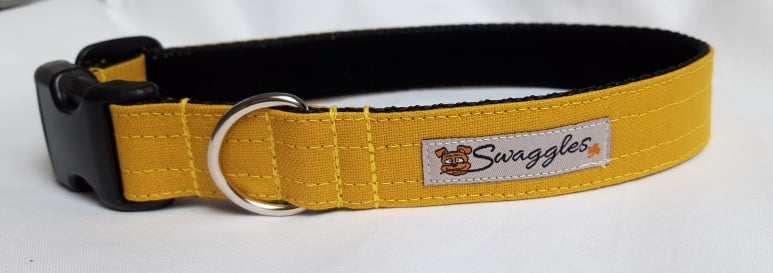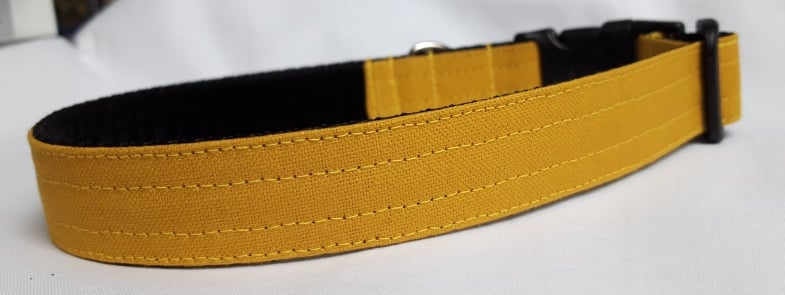 A hard wearing canvas in a gorgeous mustard colour, ideal for adding embroidery and a metal buckle for that extra bit of sparkle! The collar is lined with black velvet ribbon.