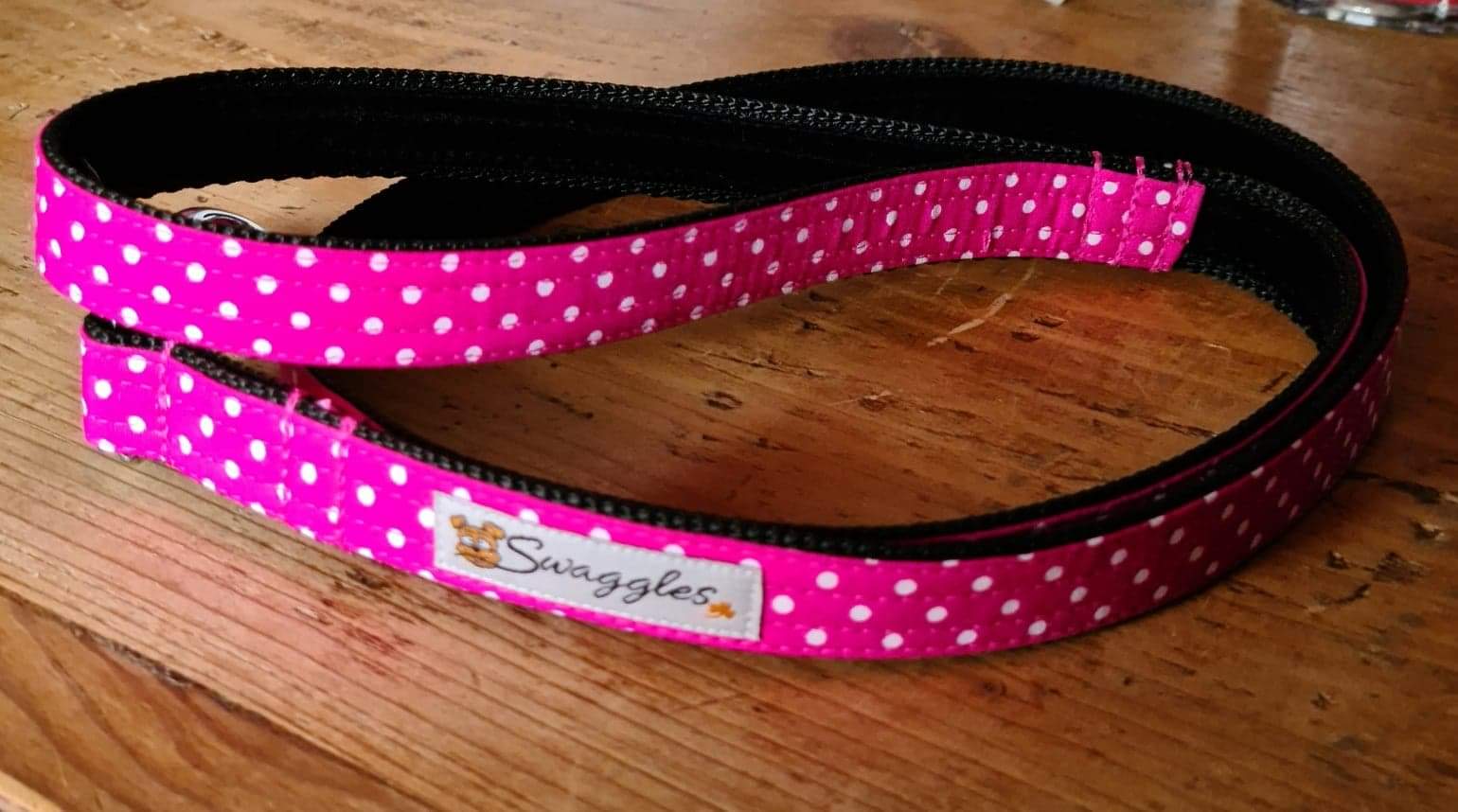 A bright & vibrant cerise pink & white spot lead, the lead is a combination of fabric on one side and black velvet ribbon on the other, handle is lined with velvet for comfort.