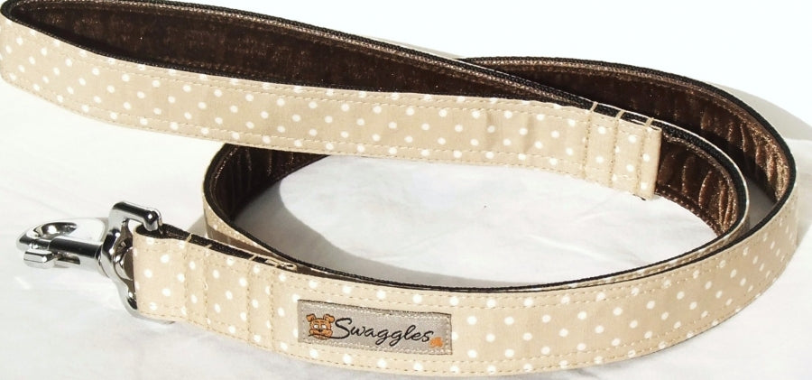 A classic cream and white spot fabric.lead is a combination of fabric on one side and black velvet ribbon on the other, handle is lined with velvet for comfort.