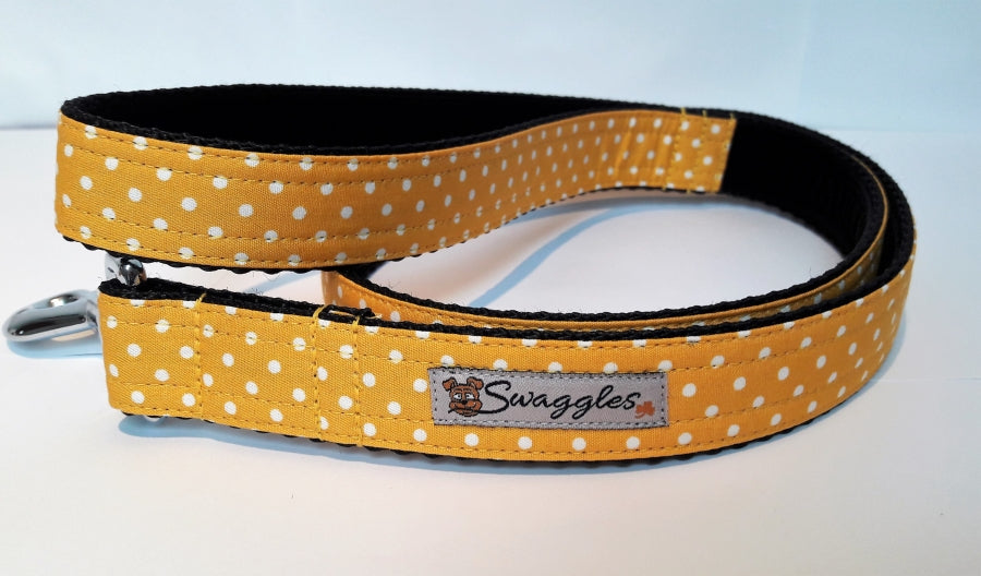 A deep yellow/gold spot fabric, lead is a combination of fabric on one side and black velvet ribbon on the other, handle is lined with velvet for comfort.