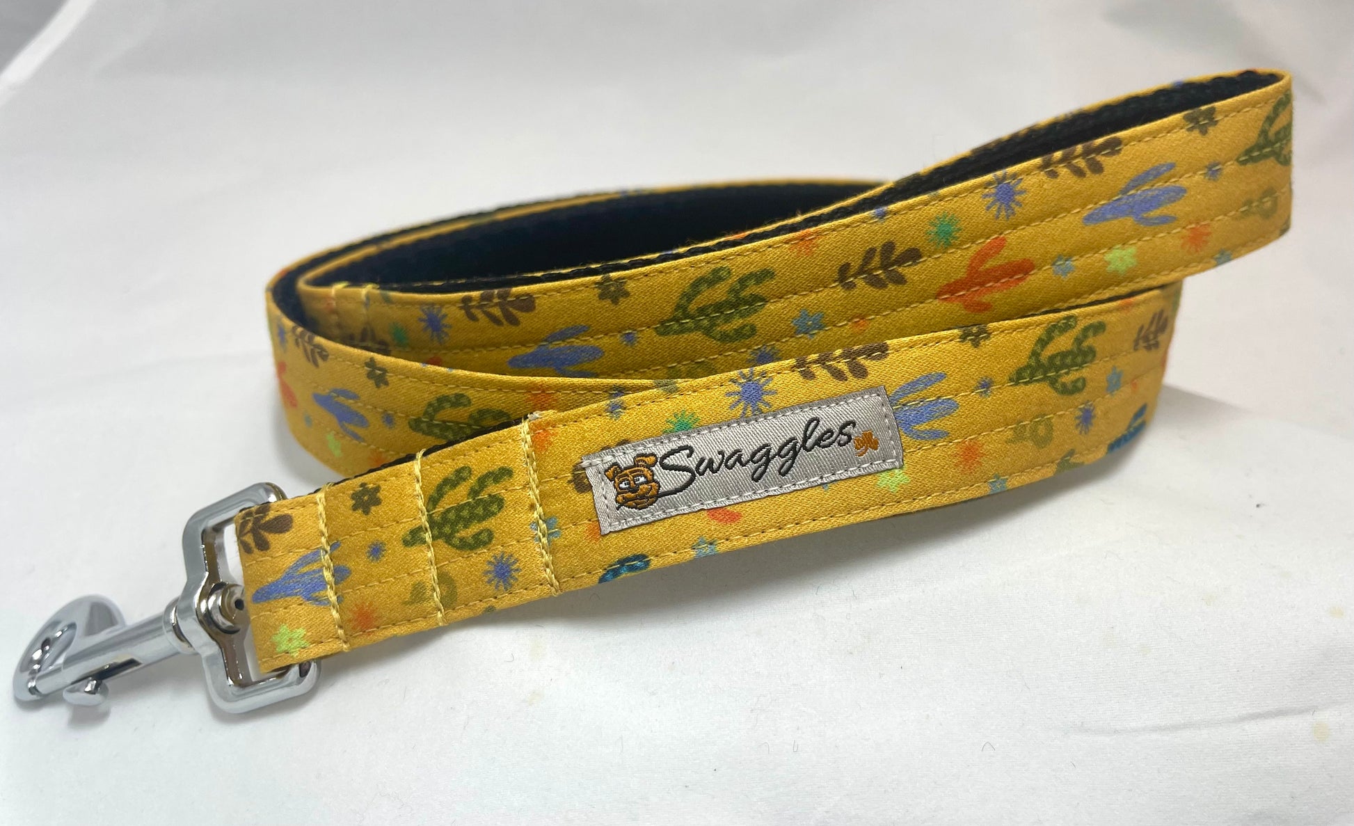 Desert cactus on sand/gold fabric, lead is fabric/black velvet combination, handle lined with velvet for comfort.