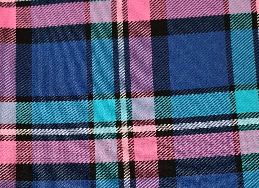 A pretty pink & royal blue tartan, the lead is a combination of fabric on one side and black velvet ribbon on the other, handle is lined with velvet for comfort.