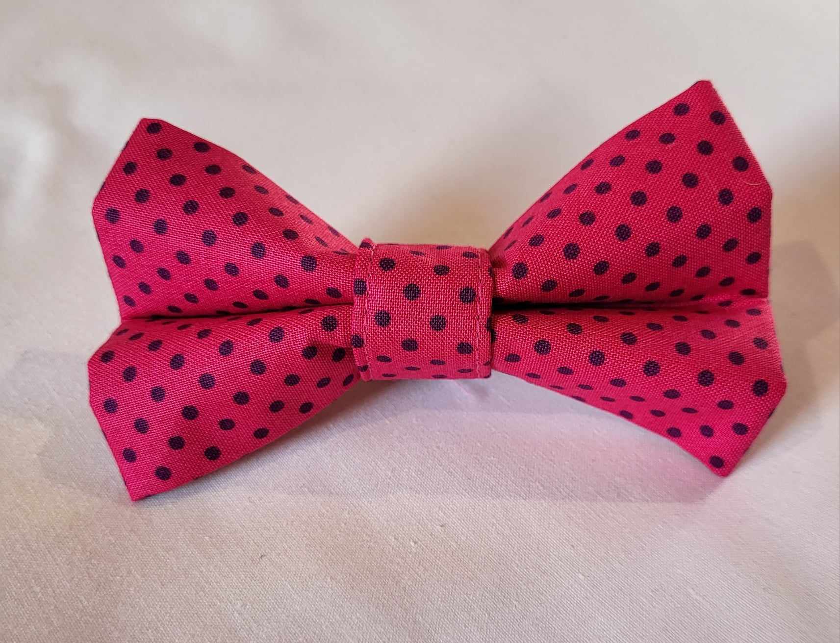 Small purple spots on a cerise pink background bow tie.